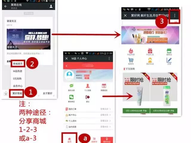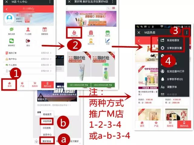 1.推广M店:点击“首页”出现商城点击“M店热卖”,进入“M店热卖”,点击右上角分享,发送给朋友,或者 分享到朋友圈