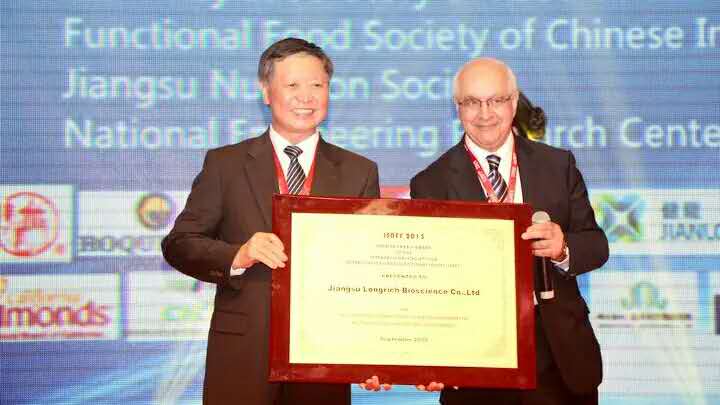 董事长徐之伟接受颁奖在晚上的颁奖典礼上,国际保健品与功能食品学会会长Dr. FereidoonShahidi授予隆力奇2015年工业成就奖。工业成就奖是ISNFF各类奖项中授予企业的最高奖,以表彰企业在保健食品领域中作出的突出贡献,董事长徐之伟上台领奖并作了分享。他首先感谢国际营养与功能食品学会长期以来对隆力奇的支持和帮助,隆力奇一直专注于为全球家庭提供健康美丽的生活方式,希望与会的专家领导可以莅临隆力奇指导工作,帮助隆力奇在功能食品研究开发方面取得更大突破。