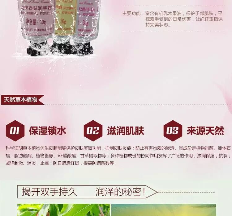 产品富含有机乳木果油、有机樱花提取物,质感轻盈丰润,唤醒肌肤本身自然运作的能力,有效滋养、保护手部肌肤,平抚双手受到的日常伤害,让纤纤玉指保持完美状态。清丽淡雅的樱花香气从指缝间淡淡流淌,令人心情愉悦每一天。