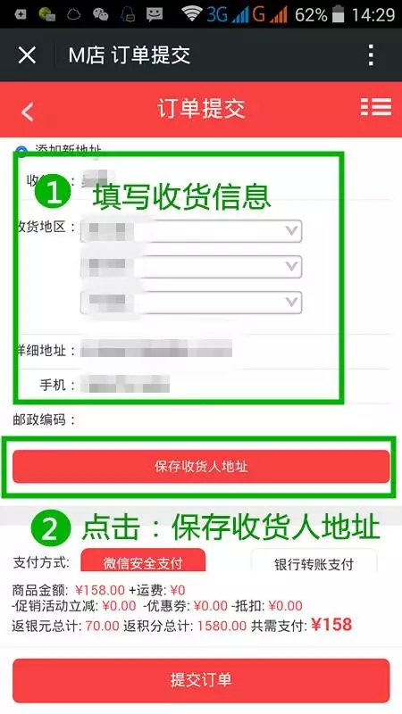 5.填写真实的收货地址和联系电话,保存收货人地址,点击提交订单
