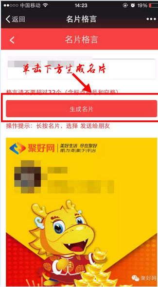 为了让广大聚粉们更方便更快捷的推广,聚好推出新功能——分享名片,您只需要生成一张名片就可以方便快捷的开始您的事业推广,玩转微营销。下面我们来体验一下他的方便快捷!