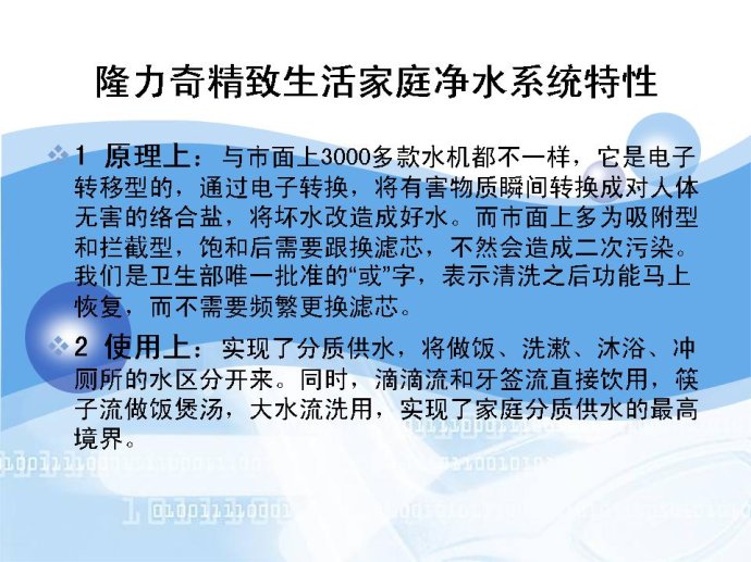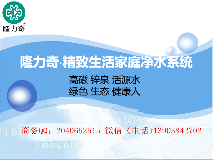 隆力奇水机是所有直销公司水机里面体积最小的,而且净化水的速度非常快!原理上:与市面上三千多款的水机都不一样,它是电子转移型的,通过电子转换,将用害物质瞬间转换成对人体无害的络合盐,将坏水改造成好水,清洗之后功能马上回复,而不需要频繁更换滤芯!而市面上多为吸附性和拦截型,饱和后需要更换滤芯,不然会造成二次污染。