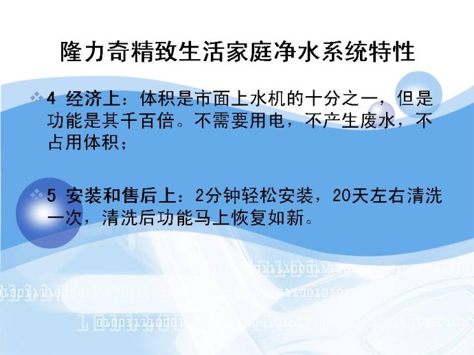 经济上:体积上是市面上水机的十分之一,但是功能是其千百倍。不需要用电,不产生废水,不占用体积。安装和售后上:2分钟轻松安装,20天左右清洗一次,清洗后功能马上恢复如新。