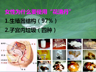 有过性生活的女性都有程度不同的妇科病,妇科病是常见的慢性病,西医是不能彻底治疗的,女性生殖器的前面是个"化工厂",后面是个"垃圾场",必需要靠日常的护理与保养,必须要靠我们五千年的"道教养生"来预防与减少发病率。"花清丹"能清除女性生殖器内四种垃圾物,月经残留物,人工流产及生孩子残留物,新陈代谢残留物和性生活残留物。