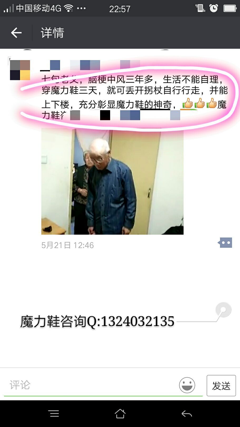 魔力鞋市场案例:左侧瘫痪的病人,说话口齿不清,走路在穿鞋前是很困难,很不稳定的状况,经过6天(每天24小时穿鞋),今天下午我再去医院探访他时,已经有了很大的进步,走路时自己觉得有力量了,说话声音已经不是“蚊子”叫了,一切在朝好的方向发展,我由衷地替他感到高兴看到视频分享,真的很激动,视频里面病人是我妹夫,认真穿鞋没几天,变化很大,现在一个人扶就可以走路,不可思议,希望他能好起来,感恩魔力鞋给他带来希望,健康!谢谢蔚蔚亲自上门,给我传递好消息(患者姐姐分享)
