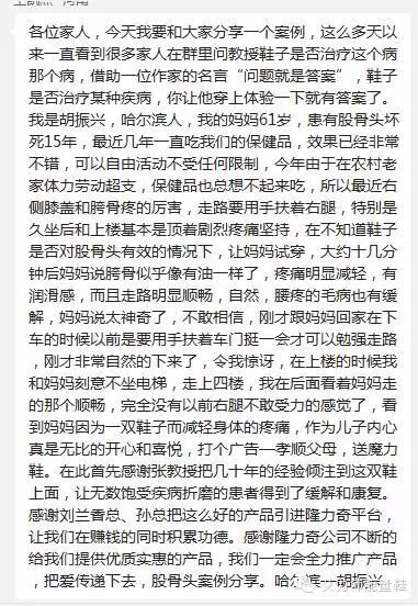 各位家人,今天我要和大家分享一个案例,这么多天以来一直看到很多家人在群里问教授鞋子是否治疗这个病那个病,借助一位作家的名言“问题就是答案”,鞋子是否治疗某种疾病,你让他穿上体验一下就有答案了。我是胡振兴,哈尔滨人,我的妈妈61岁,患有股骨头坏死15年,最近几年一直吃我们的保健品,效果已经非常不错,可以自由活动不受任何限制。
