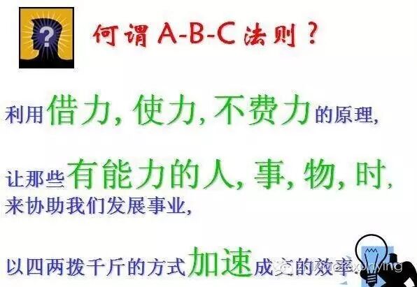 直销特训营 在做直销的过程中,直销人如何有效运用ABC法则? 【直销特训营公众平台号:zhixiaotexunying 直销特训营】 一、何谓ABC? ABC法则,是指ABC三者之间的互动关系。如果能够熟练掌握ABC法则,作好基本动作,将减少新朋友的抗拒,并增加新朋友的信心。 A:顾问---积极的上属,有一定成绩的老师,公司的网站,客服中心,书和光碟等资料,系统,会场等等。都是我们的“A”,我们一定要学会借力。善于借力。 B:桥梁---自己。是真正的主角,是否成功百分之八十在“B”。 C:顾客---我们的新朋友。