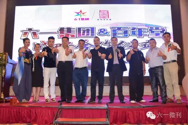 【六一集团副董事长邓盛与百年堂总裁黄涛进行签约仪式】随后,百年堂董事长王博先生发表了重要讲话,描述了百年堂从创业初期到如今誉满中华的历程,此次与六一合作,最重要的是看中了六一集团金克成董事长的事业格局和人格魅力,同时也十分看好六一集团创新型的商业模式,在接下来与六一的合作中一定全力保障产品优良的品质,让双方合作共赢。