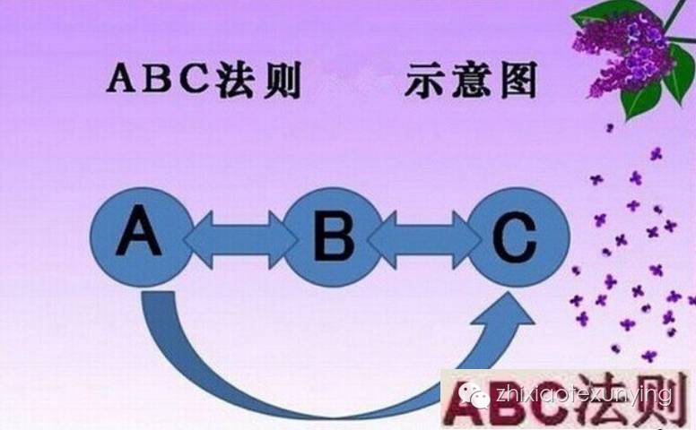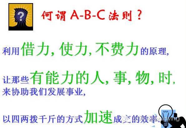 ABC法则被直销行业称为黄金法则,成功法则!具有极高的成功率。成功的关键在于借力,ABC法则,也叫借力使力法则。