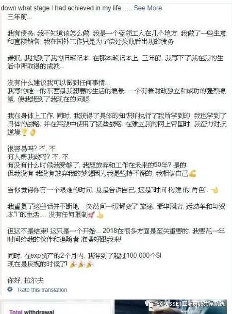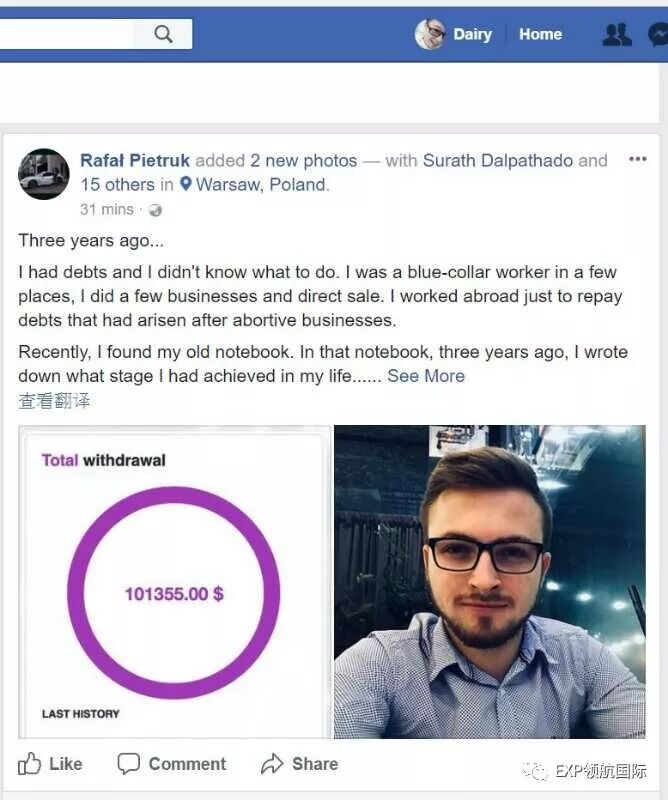 近期我一直在关注FACEBOOK上,各个国家的EXP投资者和经营者对于EXP的谈论,看着国外的伙伴取得的成功,真的证明这个项目是非常棒非常让人兴奋的!