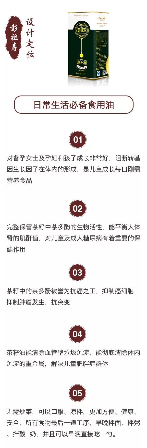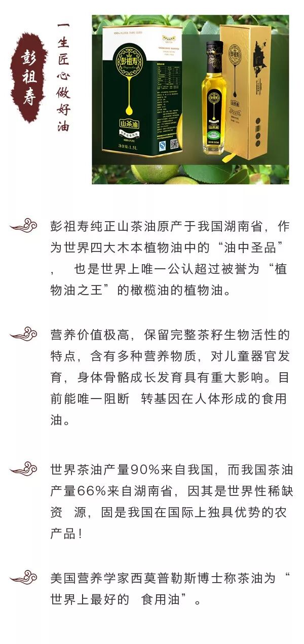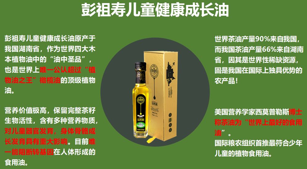 彭祖寿儿童用油里面所含的活性茶多酚:解毒,抗辐射,阻断转基因生长因子在体内形成。清除血管壁有毒物质,抑制肿瘤,抗突变,抗氧化,抗癌率高达百分之九十八,被医学界誉为“辐射克星”、“抗癌之王”,油茶独有的生物活性物质。